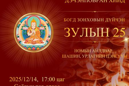 Зулын 25 буюу Богд Зонховын их дүйчин өдөр 12 сарын 14-ний Ням гарагт тохионо.