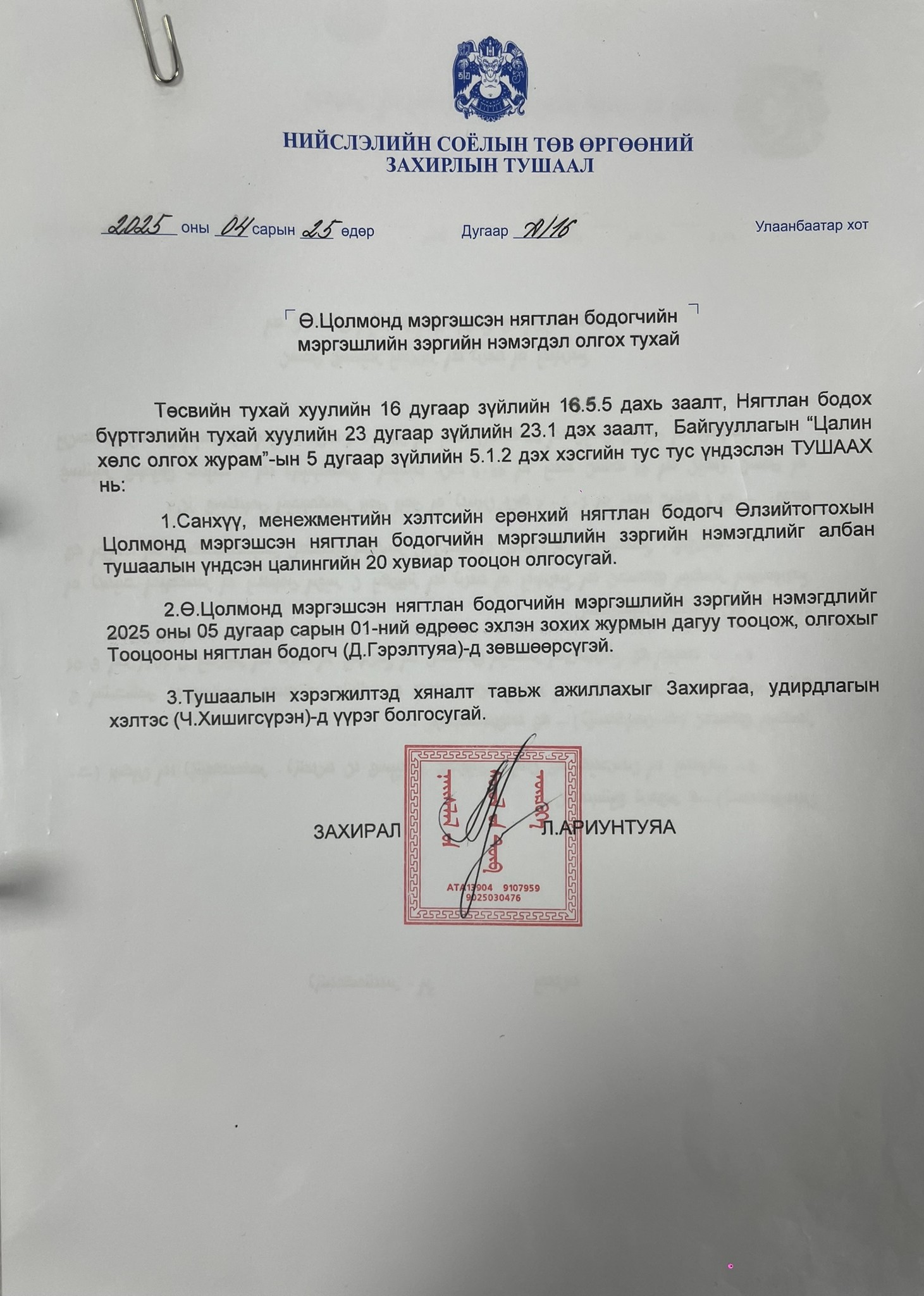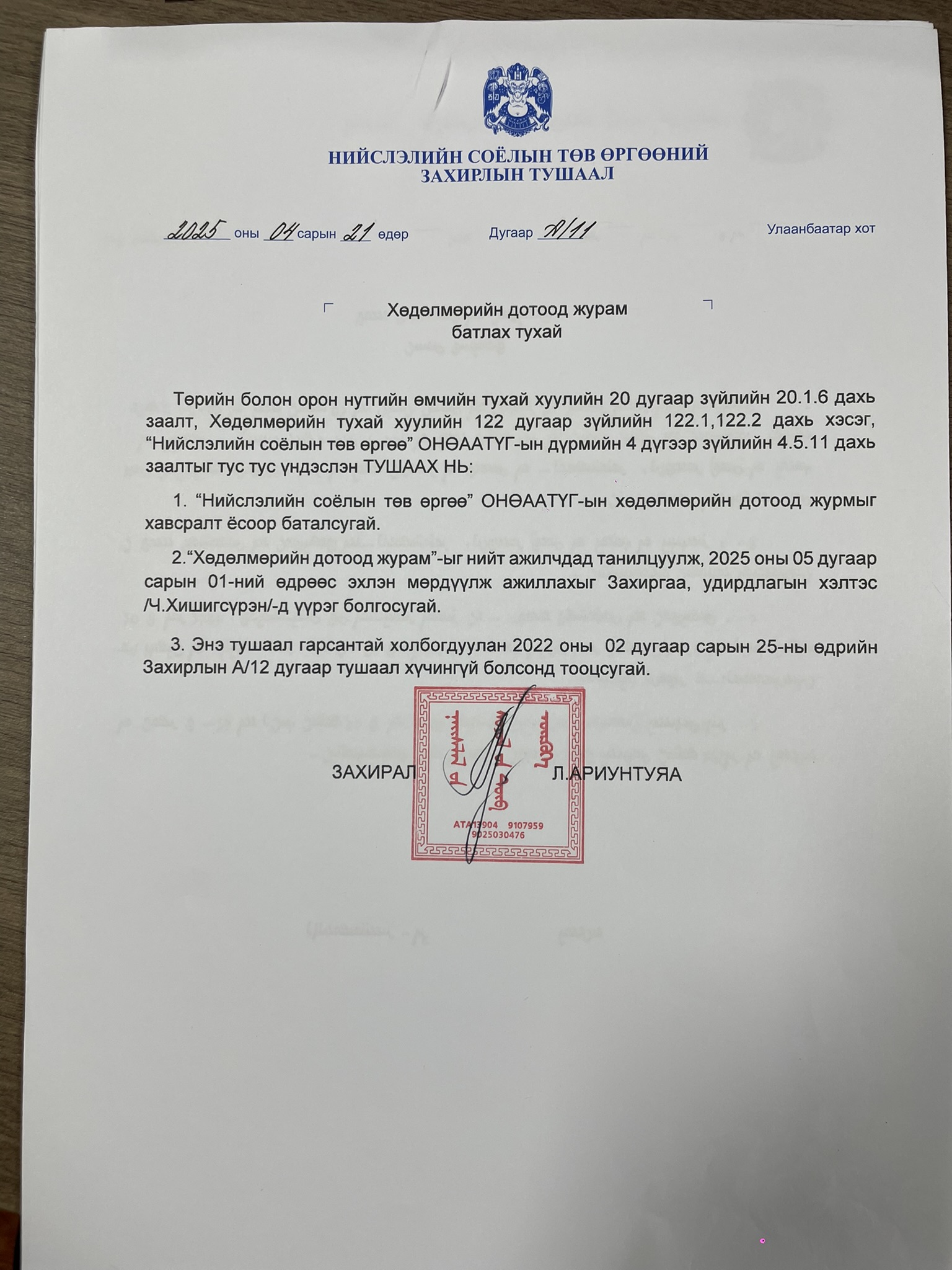 "Нийслэлийн Соёлын Төв өргөө"-ний даргын 2025 оны 4 сард гаргасан тушаал