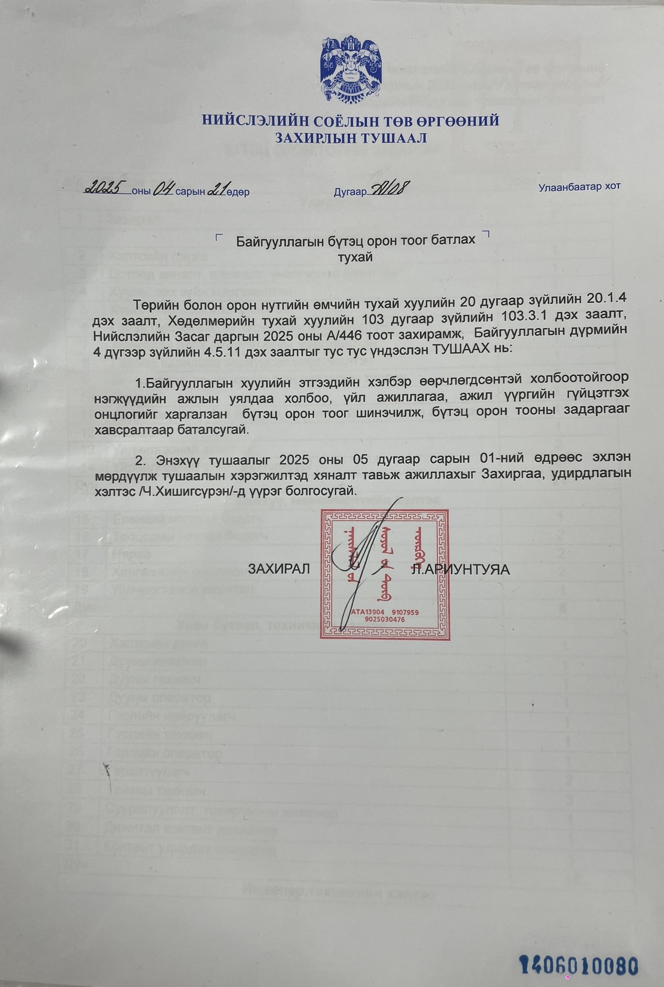 "Нийслэлийн Соёлын Төв өргөө"-ний даргын 2025 оны 4 сард гаргасан тушаал
