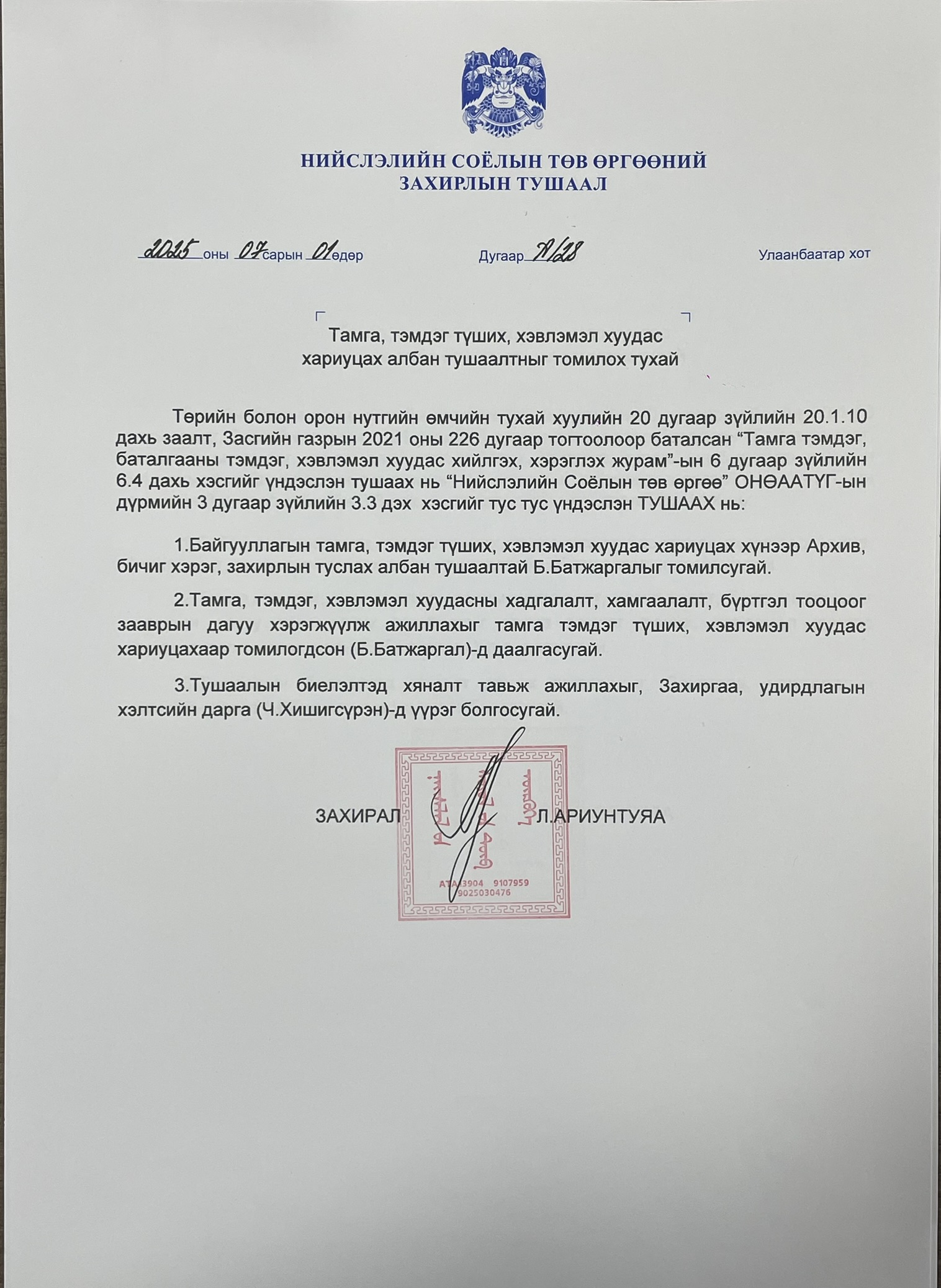 НСТӨний даргын тушаал