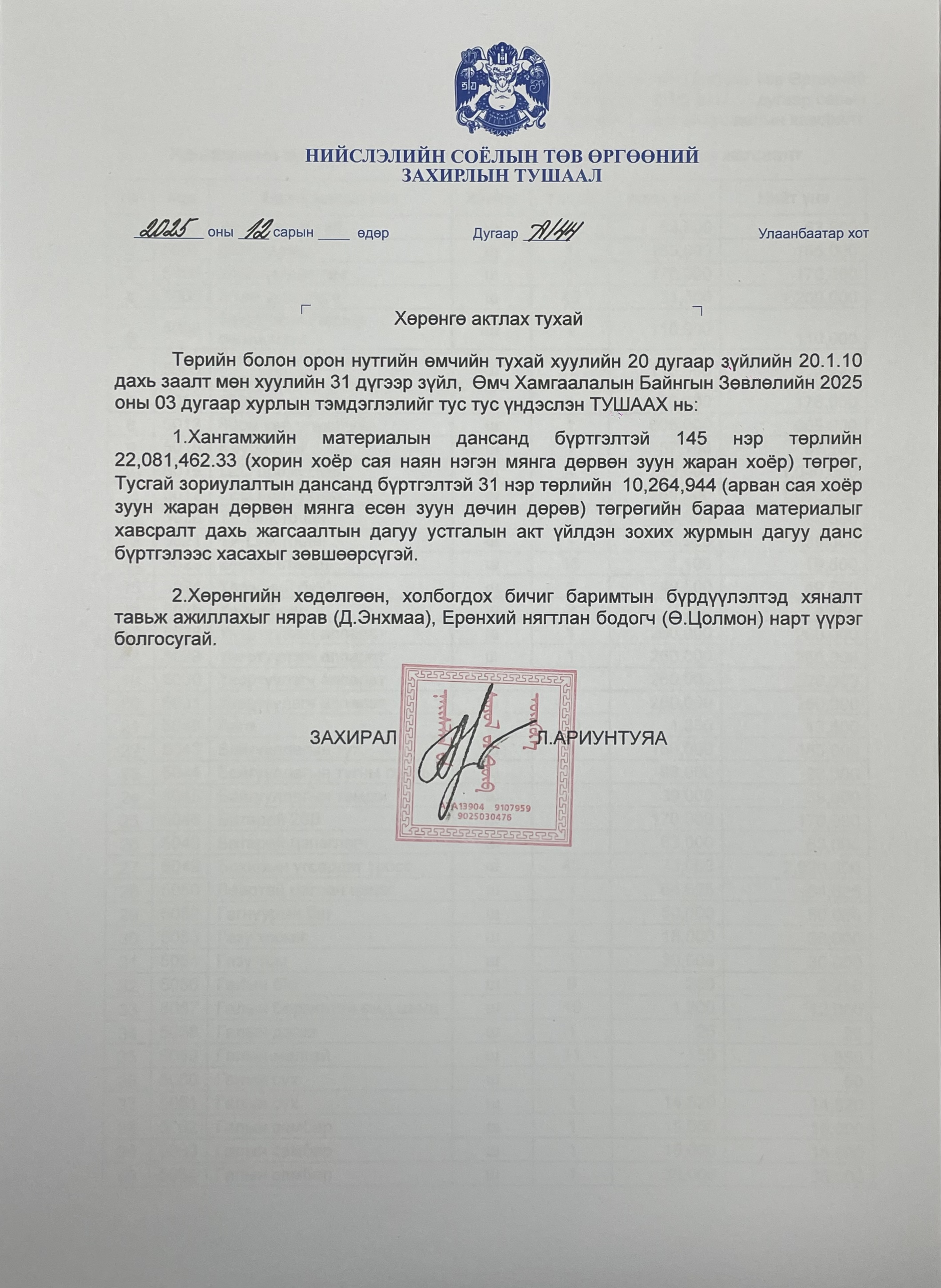 "Нийслэлийн Соёлын Төв өргөө"-ний даргын 2025 оны 12 сард гаргасан тушаал