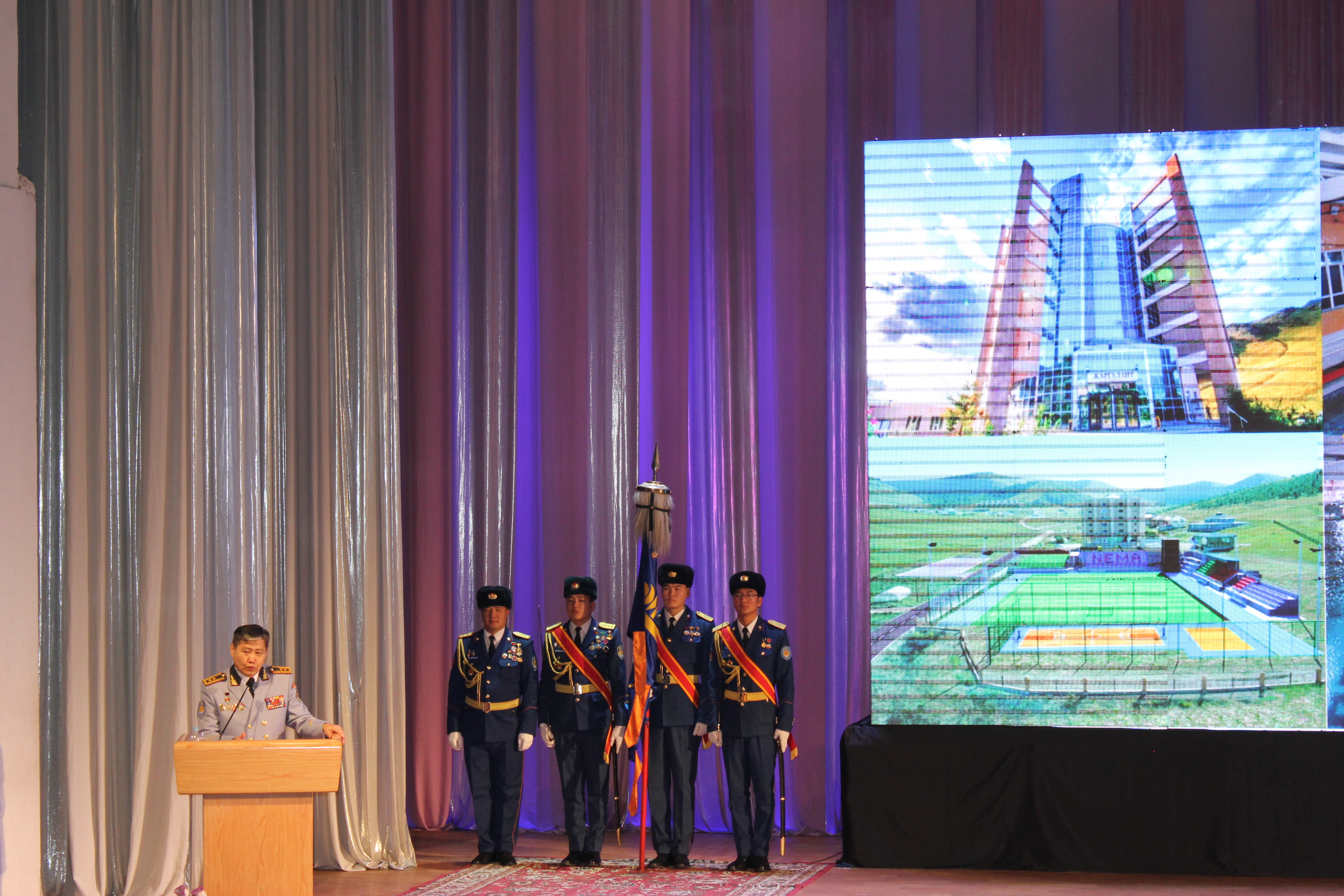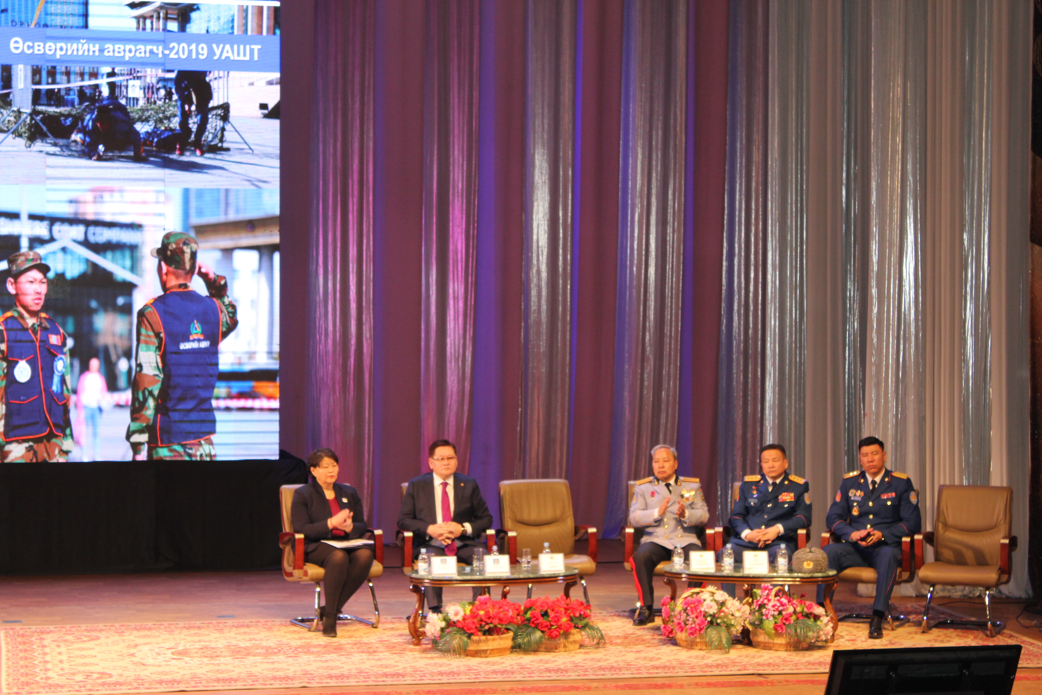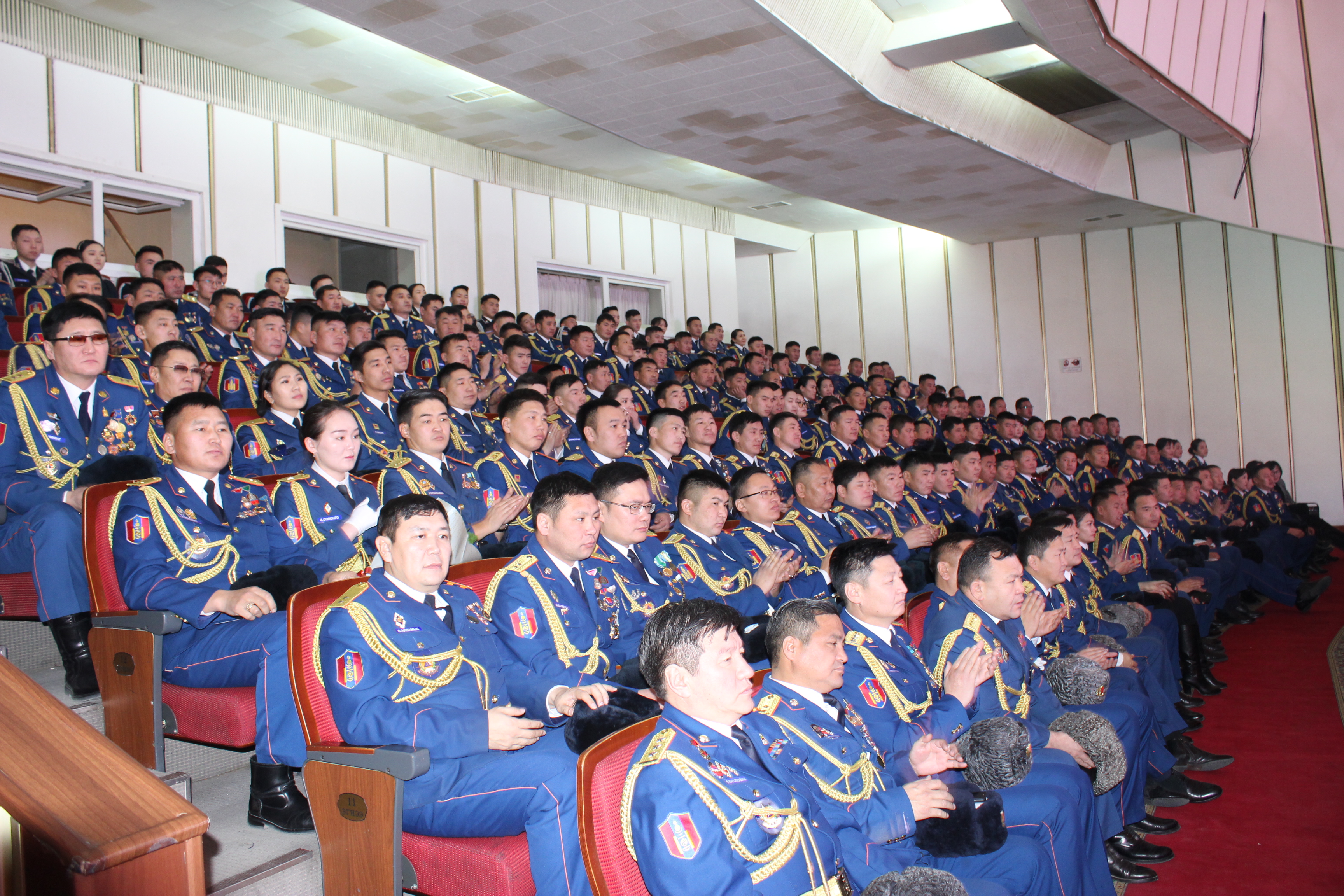 Нийслэлийн Соёлын Төв Өргөөний их танхимын тайзнаа 2019 оны 12 дугаар сарын 20-ны өдөр Онцгой байдлын байгууллагын 2019 оны үйл ажиллагааны тайлангийн хурал явагдаж байна. Тайлангийн хурлыг нээж МУ-ын шадар сайд Ө. Энхтүвшин Онцгой байдлын байгууллагын алба хаагчдад хандаж үг хэллээ.