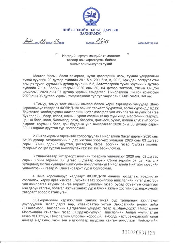 ИРГЭДИЙН ЭРҮҮЛ МЭНДИЙГ ХАМГААЛАХ ТАЛААР АВЧ ХЭРЭГЖҮҮЛЖ БАЙГАА АЖЛЫГ ЭРЧИМЖҮҮЛЭХ ТУХАЙ НИЙСЛЭЛИЙН ЗАСАГ ДАРГЫН А/223 ДУГААР ЗАХИРАМЖ