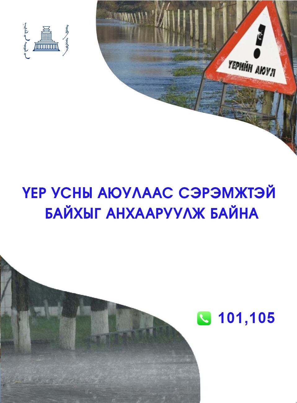 Хүн бүр өөрийн болон бусдын аюулгүй байдлыг хангах үүрэгтэй тул үер, усны аюултай нөхцөлд сэрэмжтэй байж, эрсдэлээс урьдчилан сэргийлцгээе!