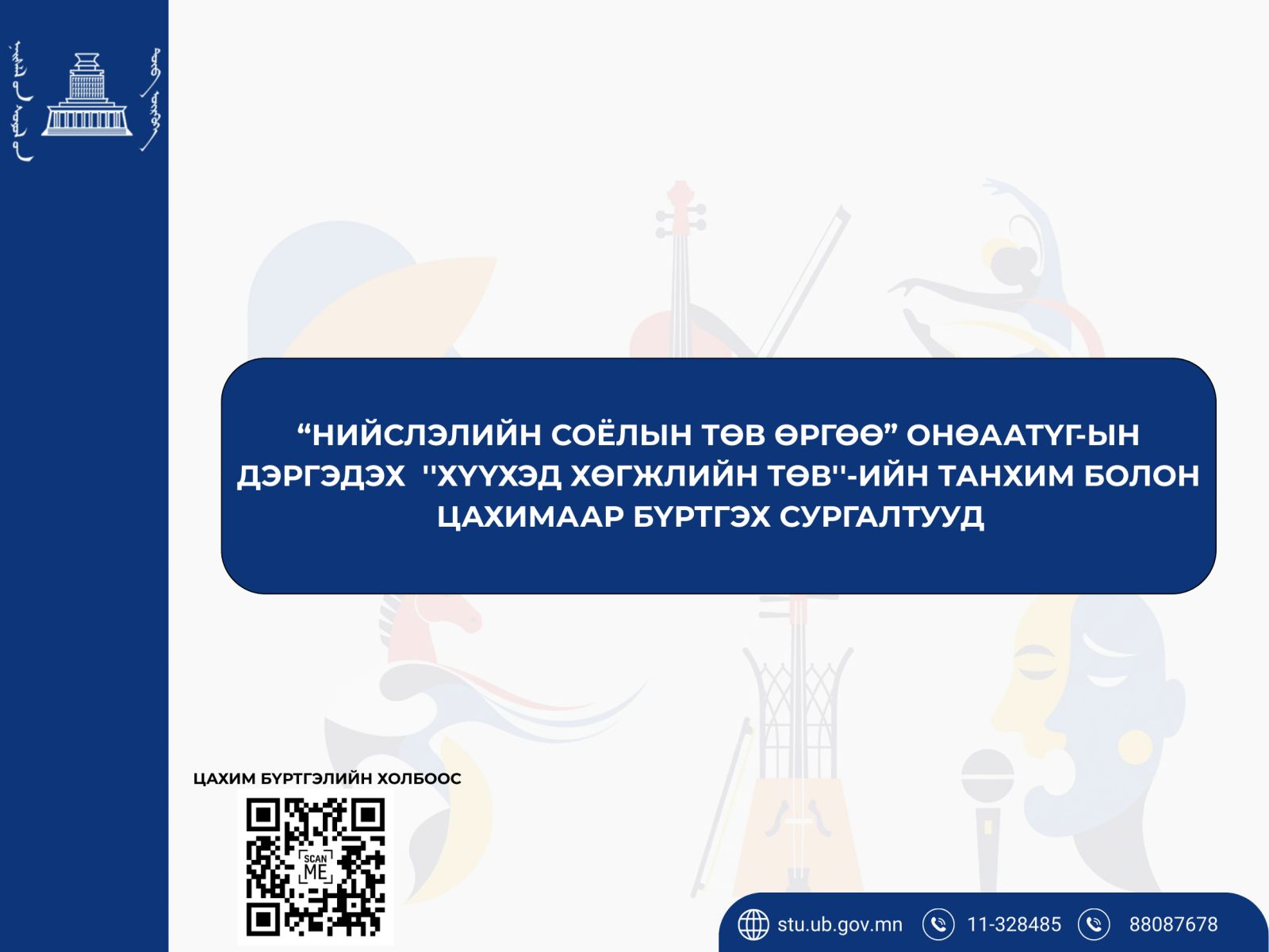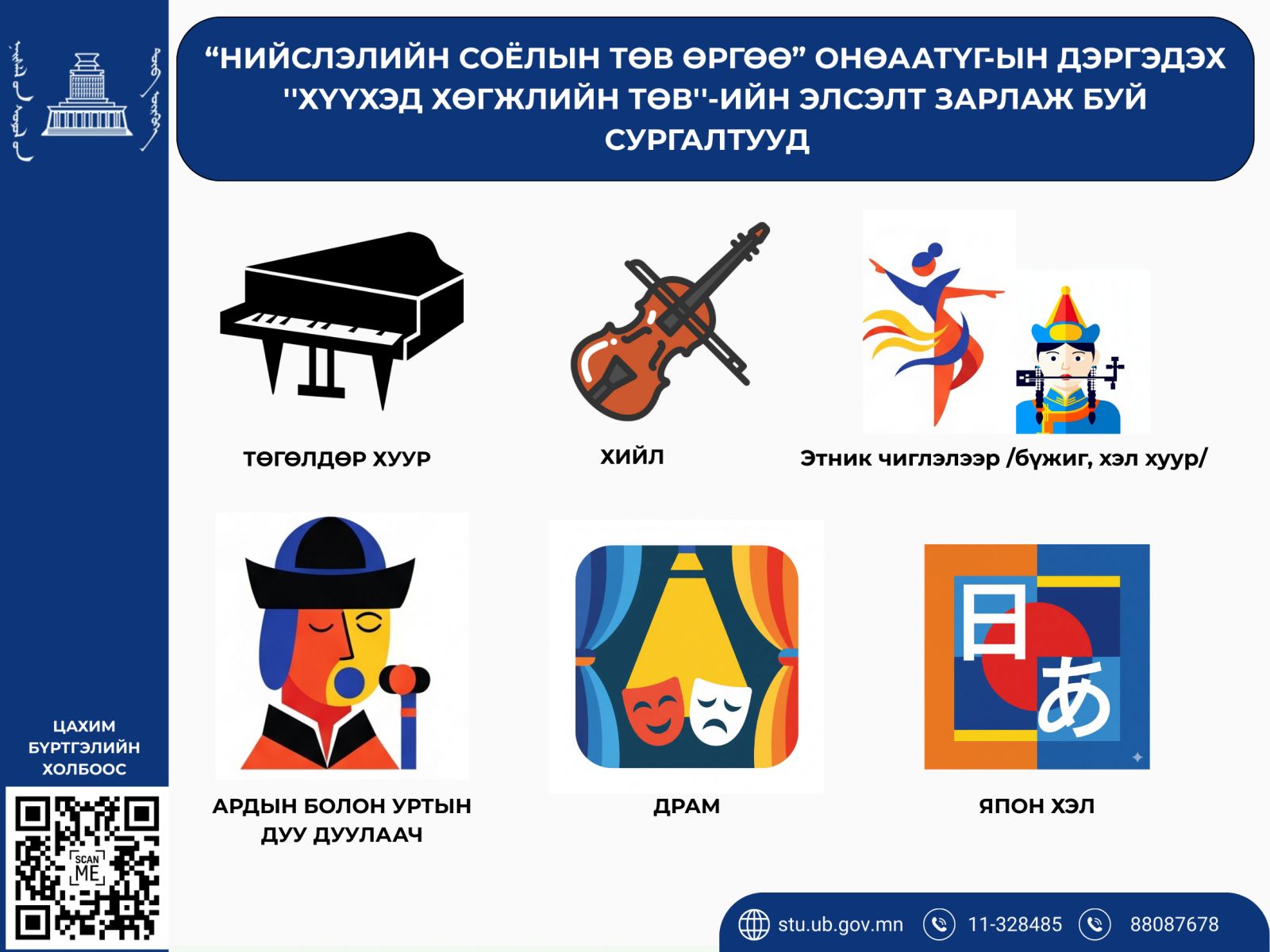 “Нийслэлийн Соёлын төв Өргөө” ОНӨААТҮГ нь нийслэлийн ЕБС-ийн дунд, ахлах ангийн сурагчдын чөлөөт цагийг зөв боловсон өнгөрүүлэх, тэдний соёл урлагийн мэдрэмж, чадварыг хөгжүүлэх зорилгоор “Нээлттэй тайз” төслийг эхлүүлсэн. Төслийн хүрээнд энэ хичээлийн жилээс эхлэн “Хүүхэд хөгжлийн төв” байгуулан, 10-15 насны хүүхдүүдийг дараах чиглэлээр сургалтад хамруулахаар элсэлтээ зарлаж байна.