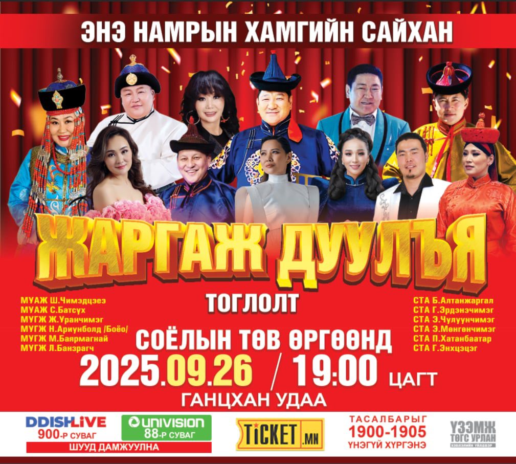 "Жаргаж дуулья ” тоглолт 9 сарын 26, 10 сарын 01-нд 19:00 цагаас Нийслэлийн Соёлын төв Өргөөнд болно.